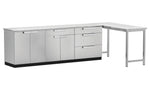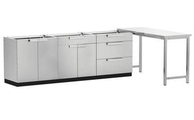 Our Outdoor Kitchen cabinets deliver quality at an affordable price, so you can have the outdoor entertainment space you've always wanted at the right price. It's our promise to you, quality products at an affordable price. Our modular system allows you to configure the right set for your space. We have 45° and 90° cabinet shelves which will allow you to build and extend your configurations to suit your space. From 3-drawer cabinets or bar cabinets which have spacious storage, to prep tables, and bar carts to add the finishing touches to a completed set. We've loaded our cabinets with the best features wrapped in a sleek, frame-less stainless steel design. Powder coated to protect it from exposure to the weather.