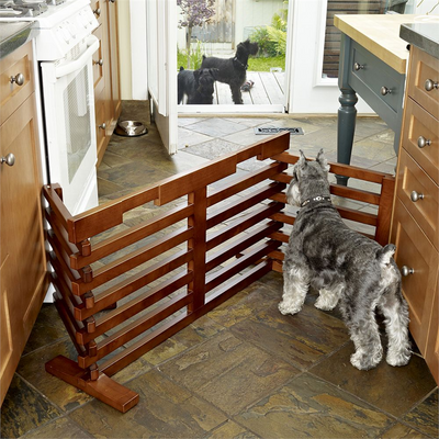 Pin hinges at each joint allow the outer panels to rotate in a circle, offering many configurations. The sleek design is stylish and functional. In walnut. Free-standing design fits openings...