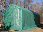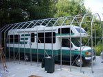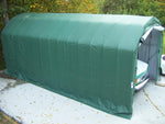 All fabric components feature heat-welded seam construction. Unit features double zipper doors on BOTH ENDS to allow access from either end, drive-through capability, and good ventilation. Each door contains a pocket for a rigid pole and grommetts for securing them up during use. The long lasting cover design provides for run-off of rain or melting snow to avoid water getting in through the perimeter of the cover. Each unit comes equipped with a set of 14 earth anchors, with a 36" stainless steel tether, and drive rod, to secure the unit at all strategic points.
