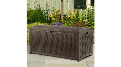 Suncast 73 Gallon Resin Wicker Deck Box Features & Specification Durable contemporary design brings style and harmony to any outdoor setting Ideal for storing patio accessories Easy 5-minute tool-free assembly...
