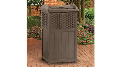 Suncast Resin Wicker Trash HideawayFeatures Durable contemporary design looks great on patio Latching lid Uses standard 30-33 gallon garbage bags Solid bottom panel Stylish container looks great on deck or...